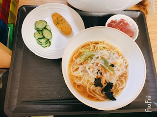 今日は味噌ラーメンの他に、バターコロッケときゅうりの酢の物と鮪のお刺身でした‼