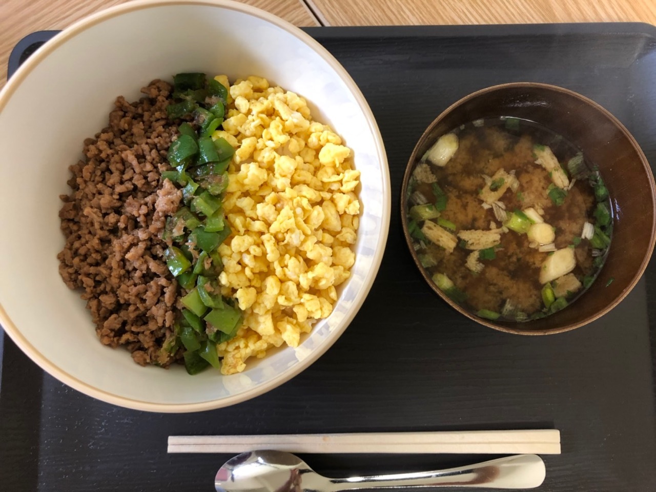 今日のランチは三色丼とお味噌汁でした!