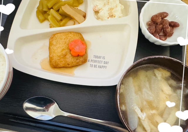 今日のお昼ご飯🥰 未分類 2025.02.03 今日は、珍しいお昼のおかずでした~🎶 おかずで「肉詰めいなり」でした♡ 皆さん、いなり寿司を想像されていたようです(笑) 大根と揚げの味噌汁は職員さんが作ってくれました💖 とても美味しかったです(^^♪