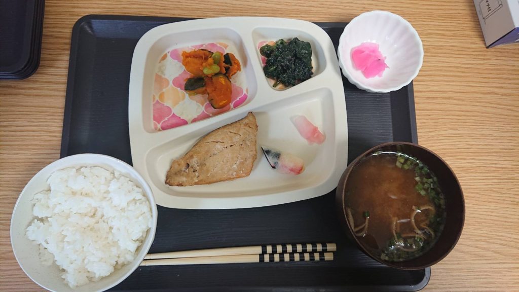 今日のお昼ご飯はサバの西京焼き、南瓜含め煮、ほうれん草の胡麻和えでした。南瓜とほうれん草の胡麻和えがおいしい!と人気でした。今日もお腹いっぱい(^^)