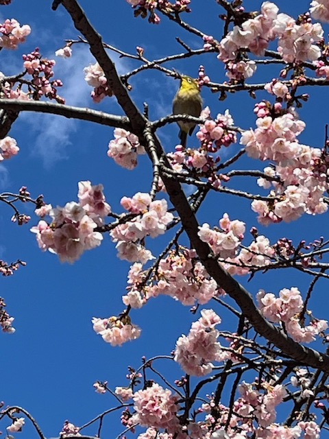 空の青さも、桜の優しいピンクも、止まってる鳥の黄色も