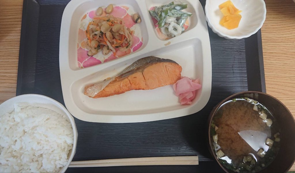 今日は、銀鮭の塩焼き、インゲンとちくわのマヨ和え、切り干し大根と大豆のみそ炒めでした。
