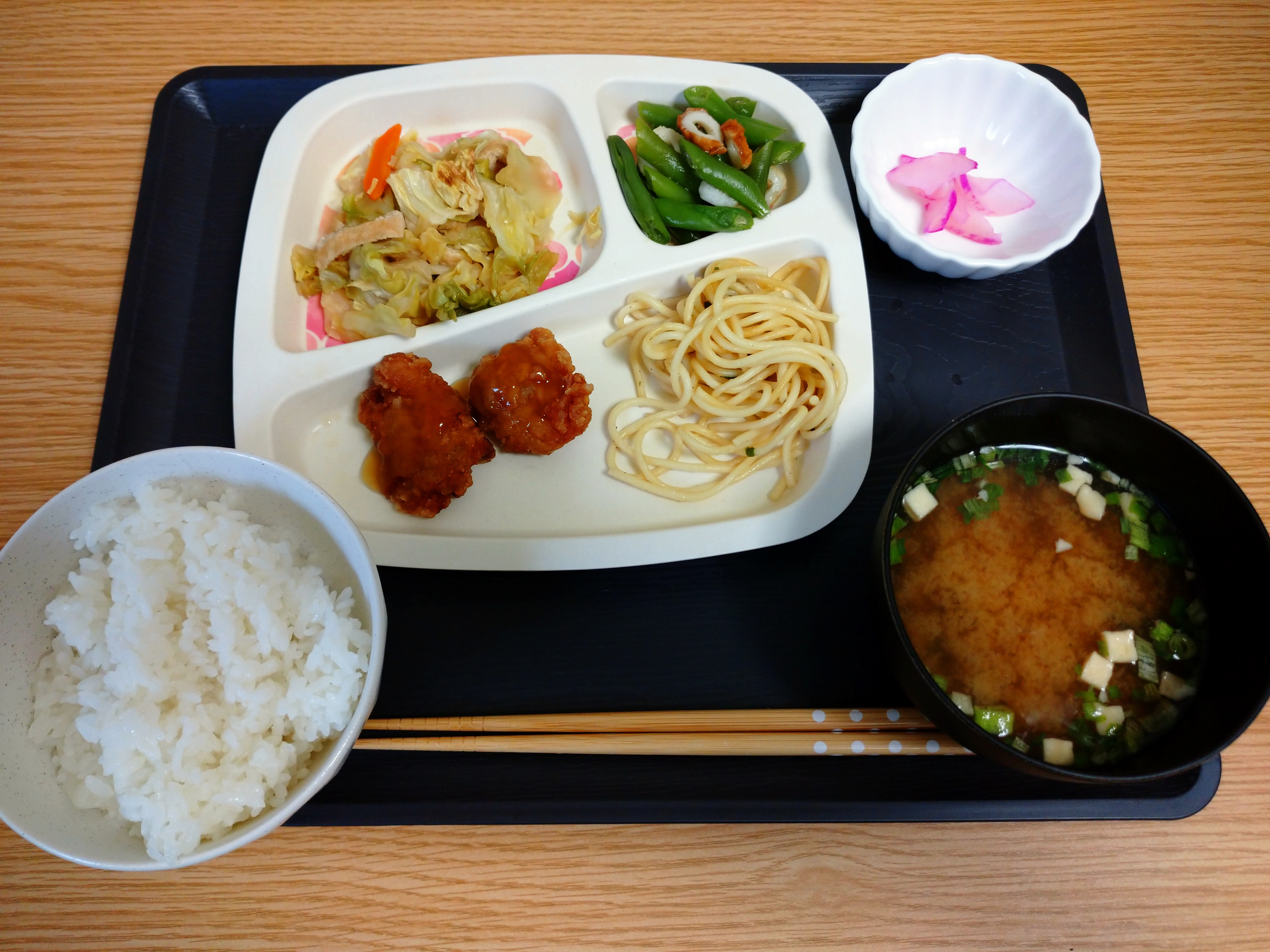 利用者さん達とお昼ご飯若鶏の竜田揚げ、キャベツと油揚げの炒め物、インゲンとちくわの和え物を美味しく頂いてゆっくり談笑していると。。。外が~~‼ふっふっ吹雪いてる~Σ( ̄ロ ̄lll)ガーン