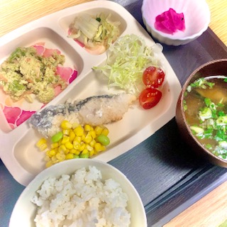 〇ほきのパン粉焼き  〇絹さやの卵とじ 〇白菜のゴマ酢あえ 〇線切りキャベツ、お漬物  〇ごはん 〇 お味噌汁