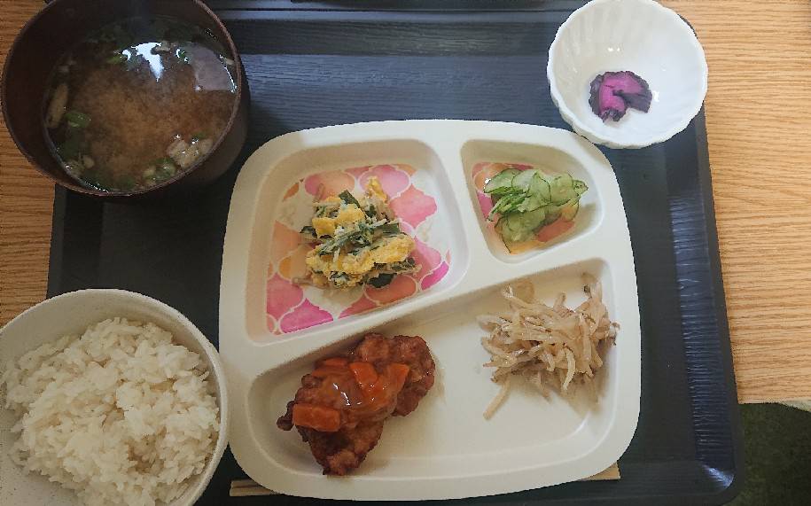 そんな利用者さん達と今日のランチは、唐揚げの黒酢のあんかけ、えのきとにらの卵とじ