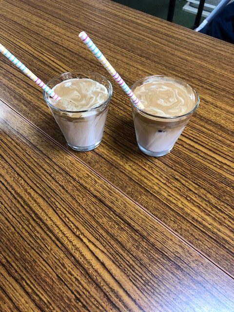 インスタントコーヒー、砂糖、お水1:1:1を入れて後はひたすらま混ぜ混ぜしてとろーり角が立つくらいまで混ぜたら牛乳に乗せて完成~