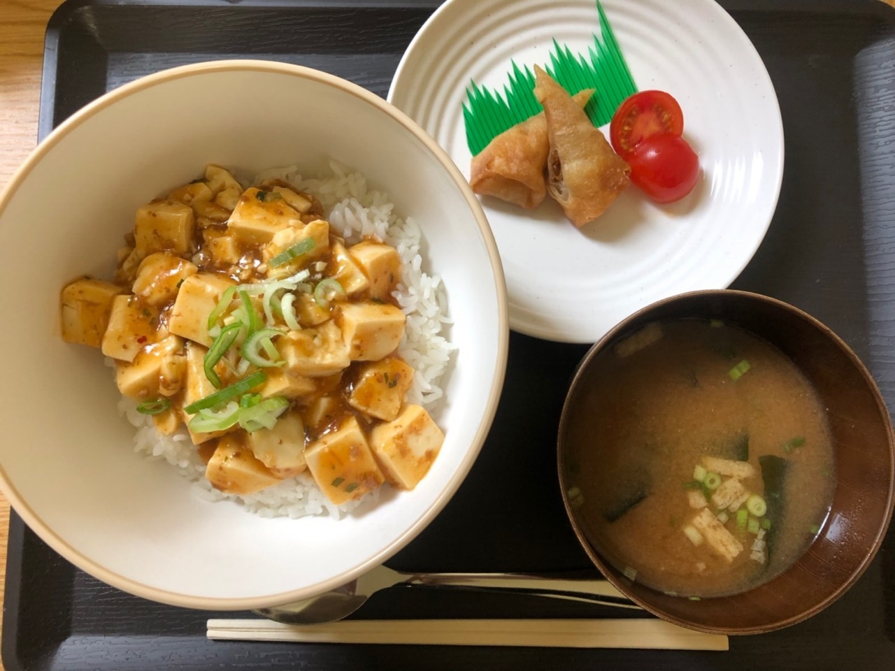 麻婆豆腐丼 あすたーの森 2019.08.22 今日のランチは、麻婆豆腐丼と春巻き、お味噌でした♪こちらも好評で、皆さん完食でしたよ♪まだまだ定員まで余裕がありますので、ご興味のある方ご連絡お待ちしております!